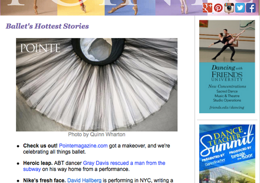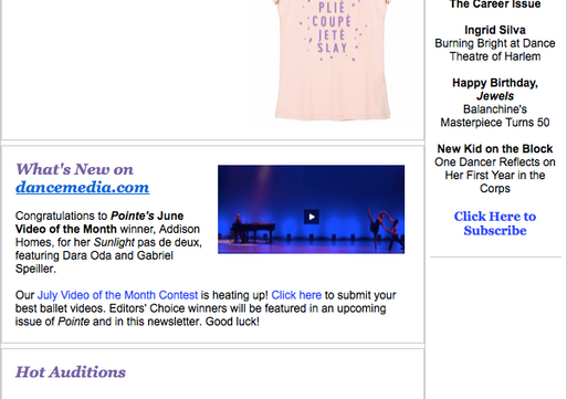 Scroll to view newsletters I produced as Pointe editorial intern. Visit my portfolio on their website to read my articles for the weekly dance history column #ThrowbackThursday!